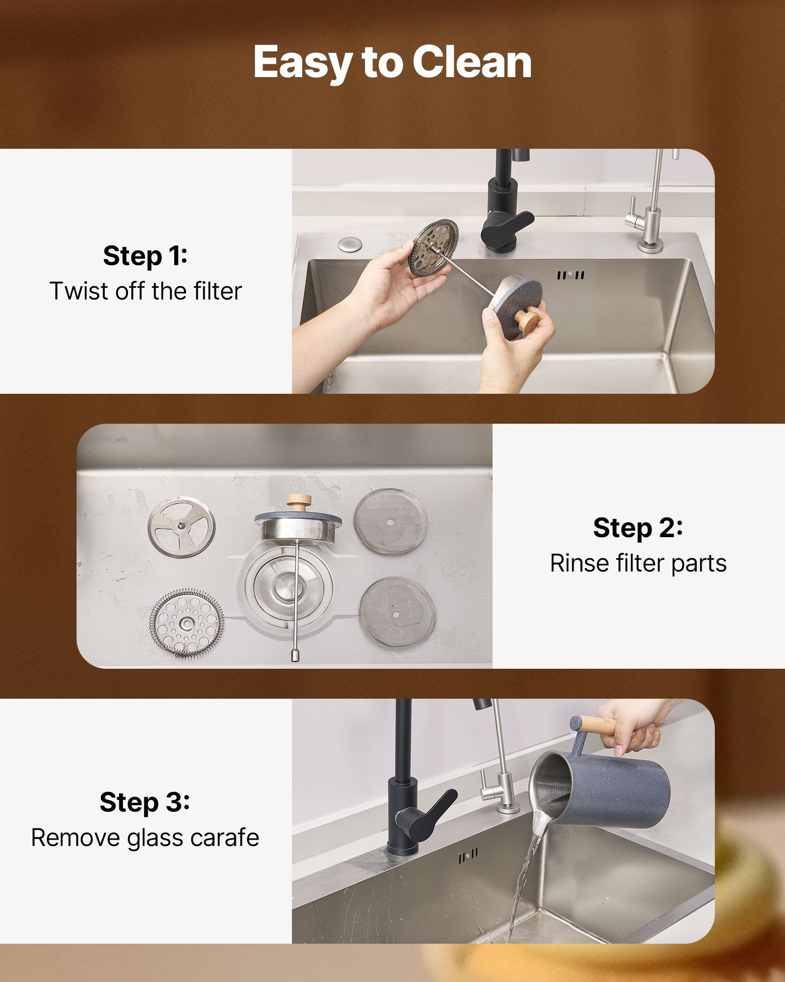 Precision Filtration System: Our coffee press features a fine filtration system with a 304 stainless steel spiral plate, mesh filter, and cross plate. It effectively removes coffee grounds for a smooth taste